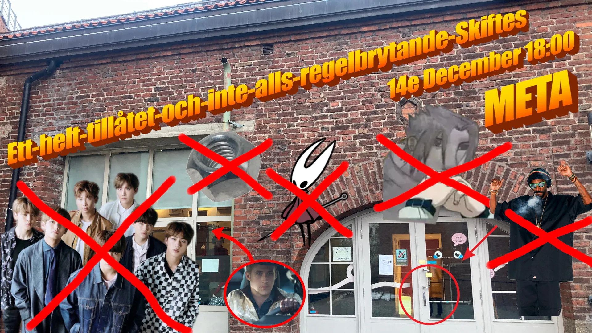 Ah, another lovely day of following every single rule in META 🌅🌅🌅 Yet another lovely day of not pulling on the door, not watching anime, and not playing Silksong 🌅🌅🌅 If you enjoy following all the rules as much as I do, then you must come to Skiftes, because it’s time for: A-totally-allowed-and-not-at-all-rule-breaking-Skiftes 😇😇😇🙏🙏🙏 Do you love following EVERY rule in META and being a good Datalog??? Then this Skiftes is for you 🫵🫵🫵 Get ready to follow exactly all the rules For those who don’t know, Skiftes is the gathering where we celebrate our incoming and outgoing officials. EVERYONE is welcome and will be there, so you don’t want to miss this 🔥🔥🔥 Where? META of course 🏠 Time? December 14th at 18:00 ⏱️ Price? For officials, 80 kr alcoholic and 40 kr non-alcoholic (🤯🤯🤯) For non-officials, 180 kr alcoholic and 140 kr non-alcoholic 💵 Dress code? Ovve of course (or equivalent) 👖 See you on the 14th 😎 /Samuel Donkey Kong Leif Hörnell, D-fest